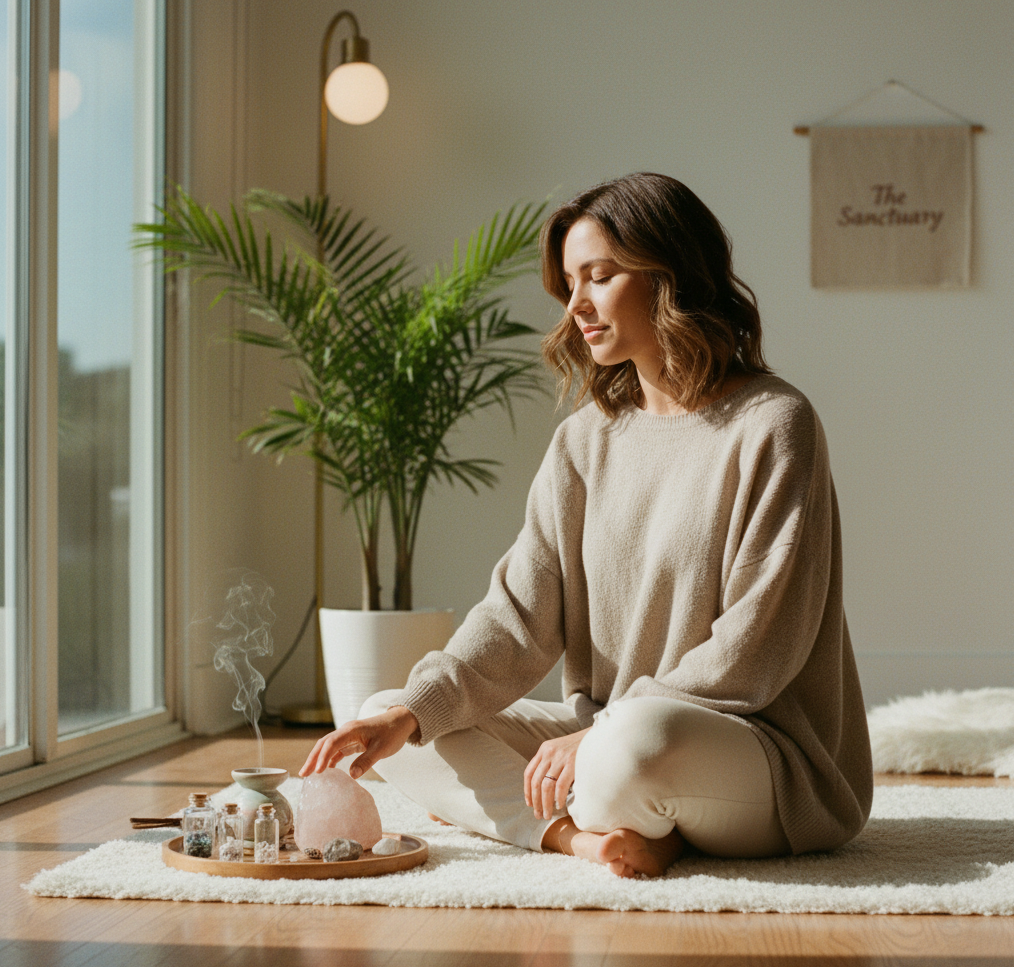 - Incense and Holder: A pink quartz incense holder and a bundle of incense sticks to create a calming atmosphere.